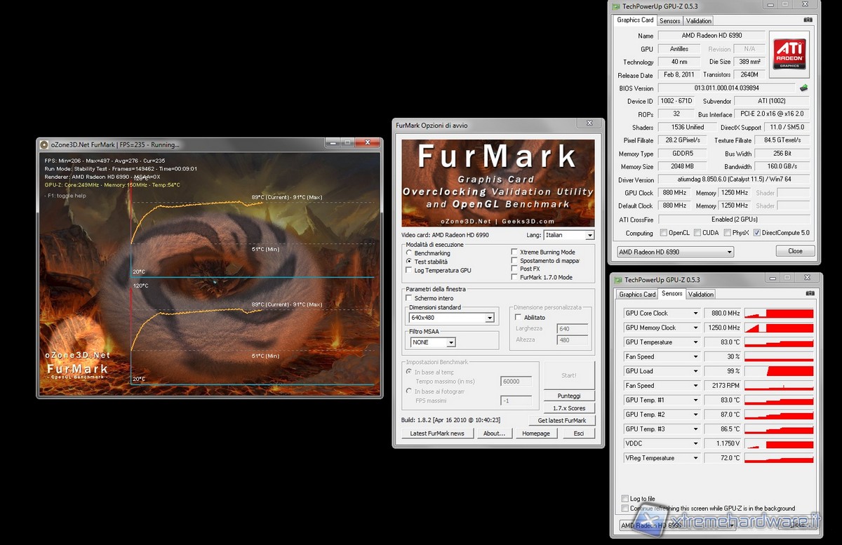 Usando invece il tool FurMark, come si può evincere dagli screen effettuati sopra, con la AMD Radeon HD 6990 in modalità OC abbiamo toccato ben 91° C come temperatura massima. Volevamo farvi notare dagli screen come l'andamento delle temperatura ha una forma sinosoidale, in quanto il sistema di dissipazione subisce ciclicamente un abbassamento ed un innalzamento del regime di rotazione della ventola centrale.